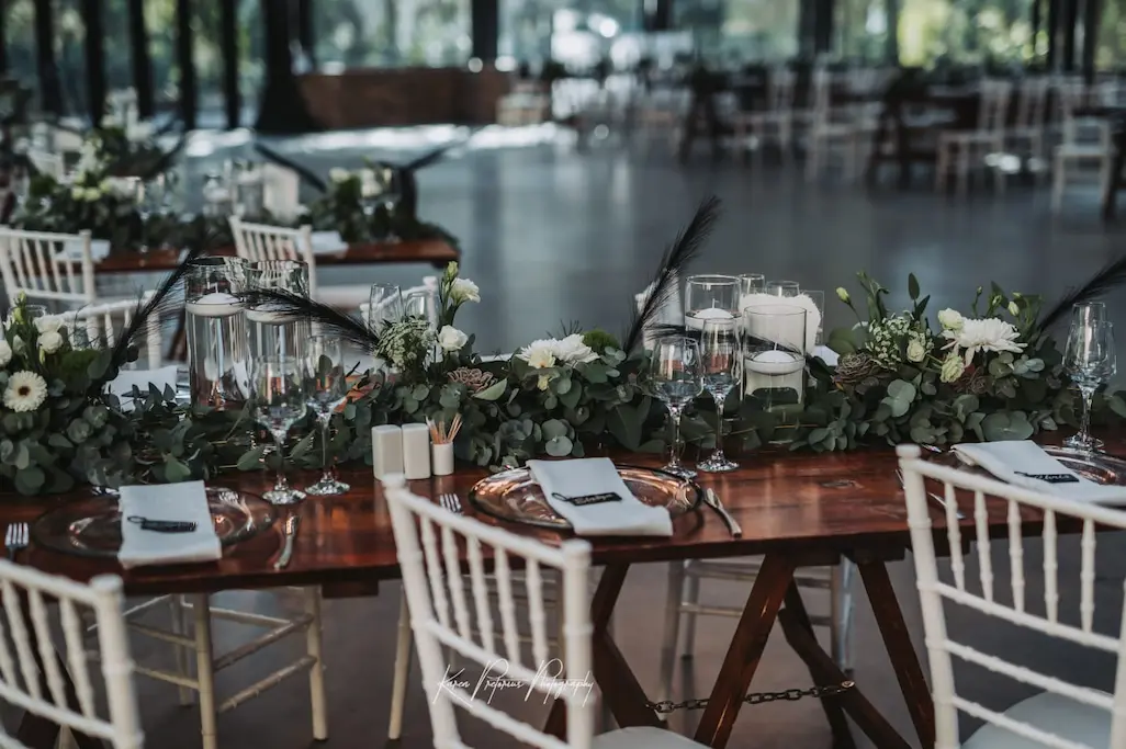 - Elegant table settings with table runners, underplates, napkins, candlesticks, and pillar candles